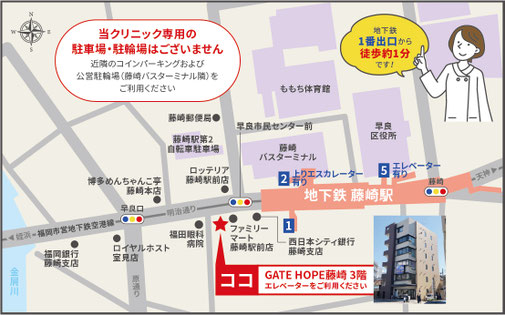 市営地下鉄藤崎駅1番出口・西鉄バス藤崎バスターミナルより徒歩約1分です
